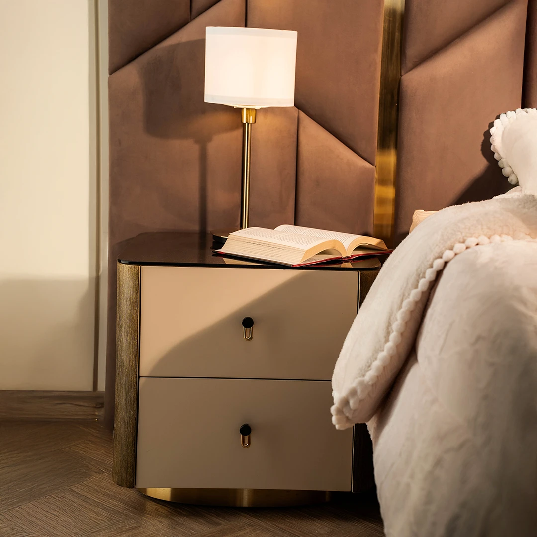 • The New Lil Bedside cabinet showcases a refined blend of matte beige drawer fronts paired with rich dark veneer sides, creating a balanced and elegant color contrast.
